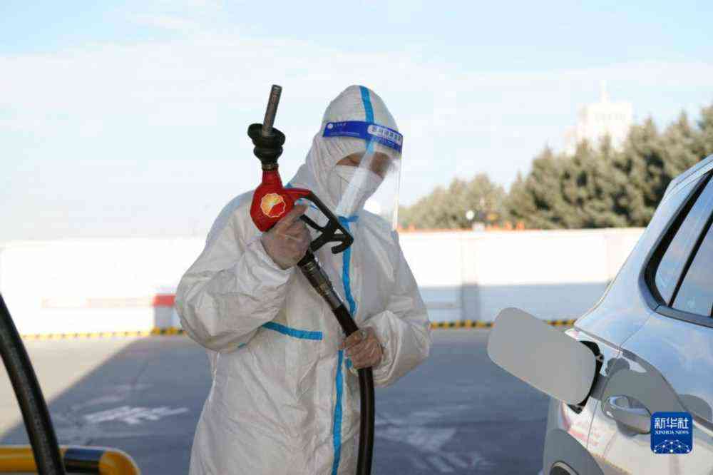 11月13日,在黑河市疫情防控指揮部應(yīng)急車(chē)輛指定加油站點(diǎn),1996年出生的加油員劉亞琦為車(chē)輛加油。