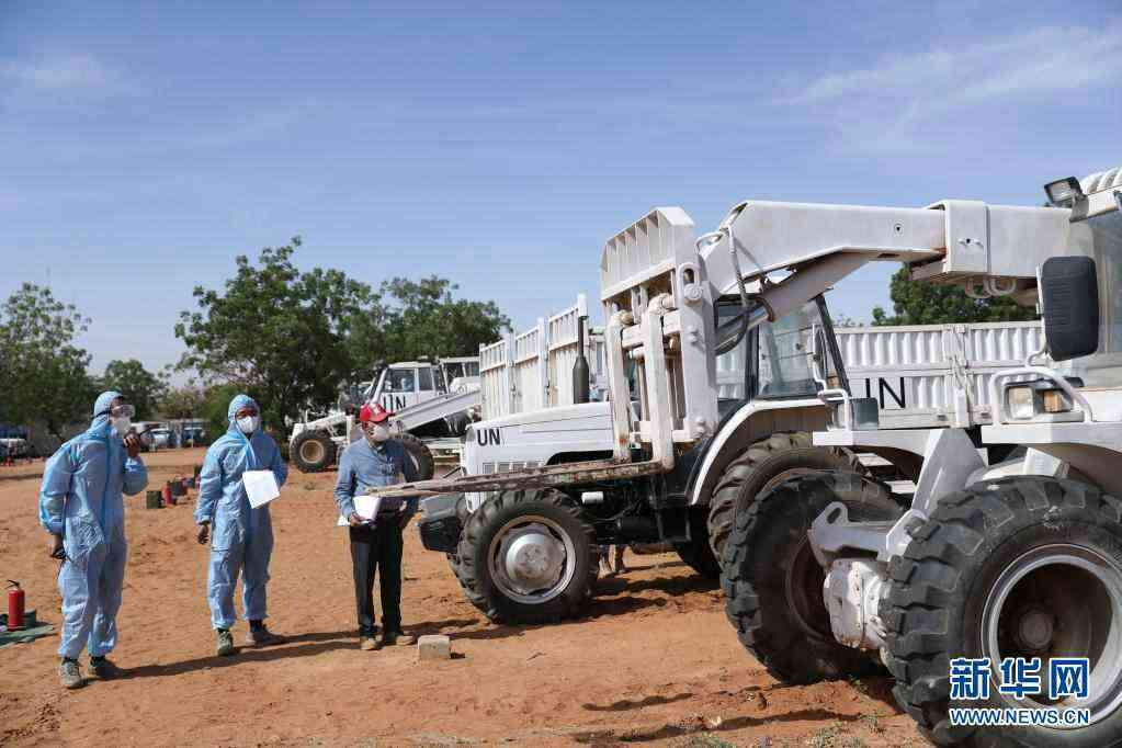 5月16日,在蘇丹法希爾,核查組工作人員檢查中國第16批赴蘇丹達爾富爾維和工兵分隊工程機械的性能。
