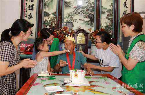 送鮮花、講故事、吹蠟燭、唱軍歌、談優(yōu)撫政策、合影留念……老人百歲生日在歡樂的喜慶氣氛中,大家陪老人度過這難忘而幸福的時刻。(武時化 鄭翠濤)
