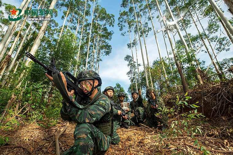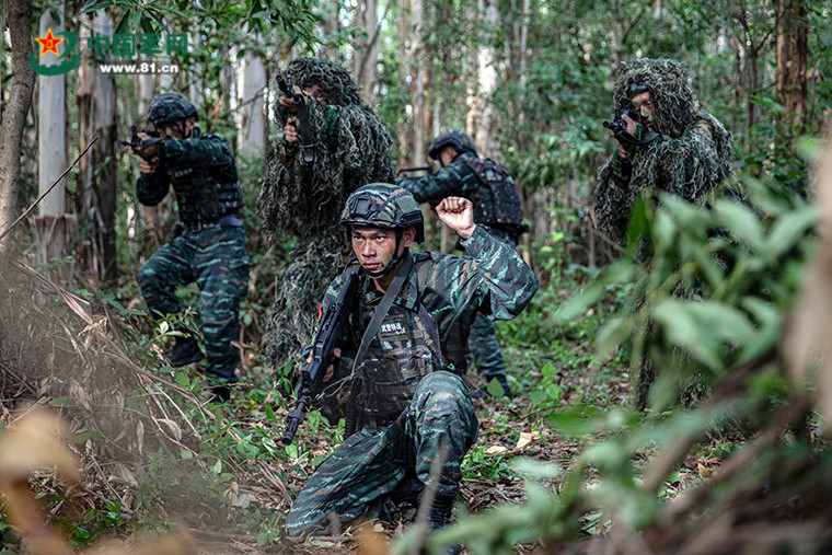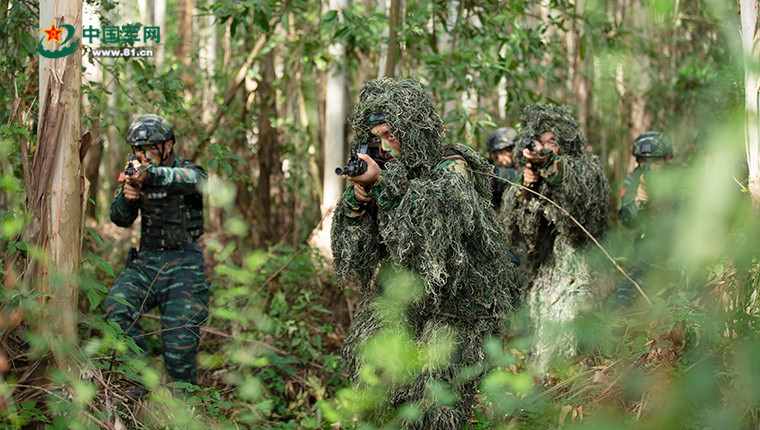 特戰(zhàn)隊(duì)員在密林中交替掩護(hù)搜索目標(biāo)。