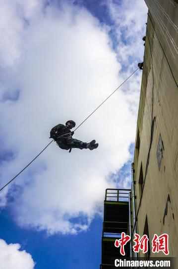 圖為特戰(zhàn)隊員正在進行定點索降?!『铘敃x 攝