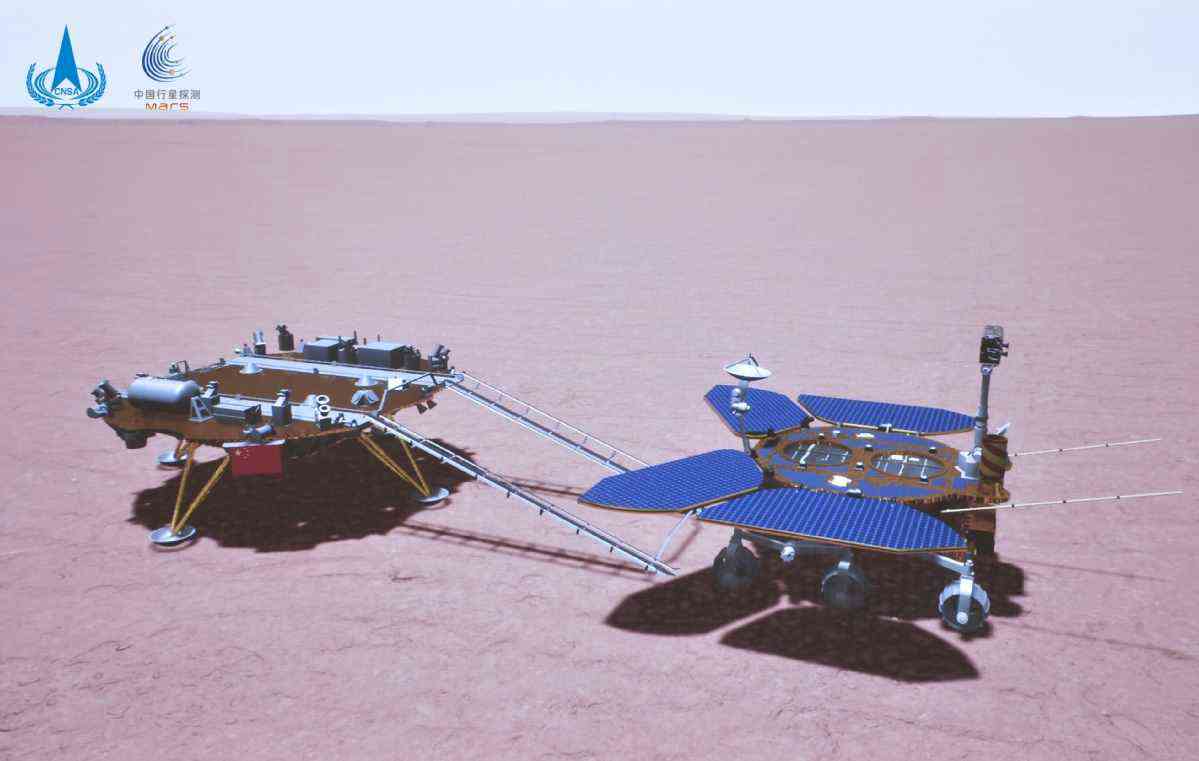 今天上午10時(shí)40分,“祝融號(hào)”火星車已安全駛離著陸平臺(tái)。(模擬圖像來(lái)源:國(guó)家航天局)