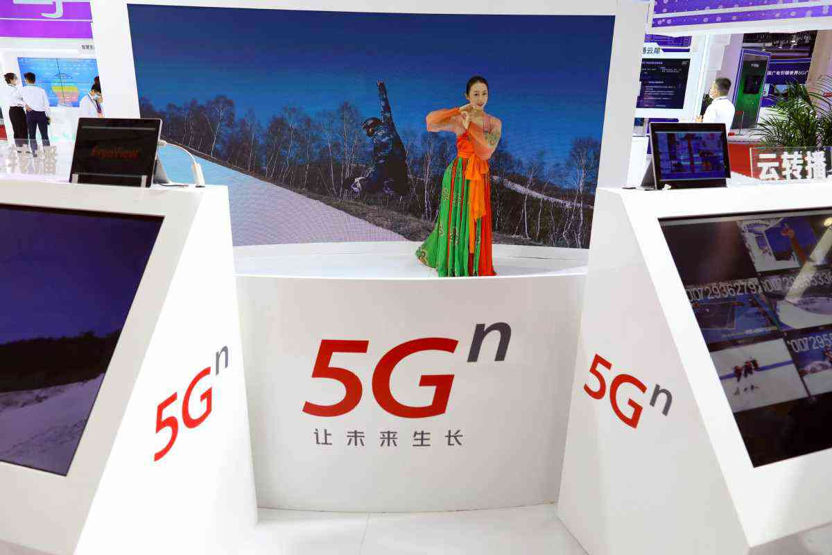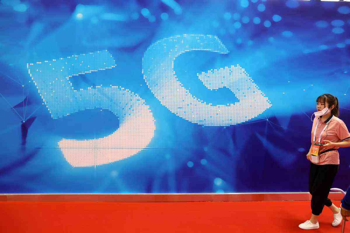 8月31日,參展商從大會展覽上5G標識展板前走過。中國日報記者 朱興鑫 攝