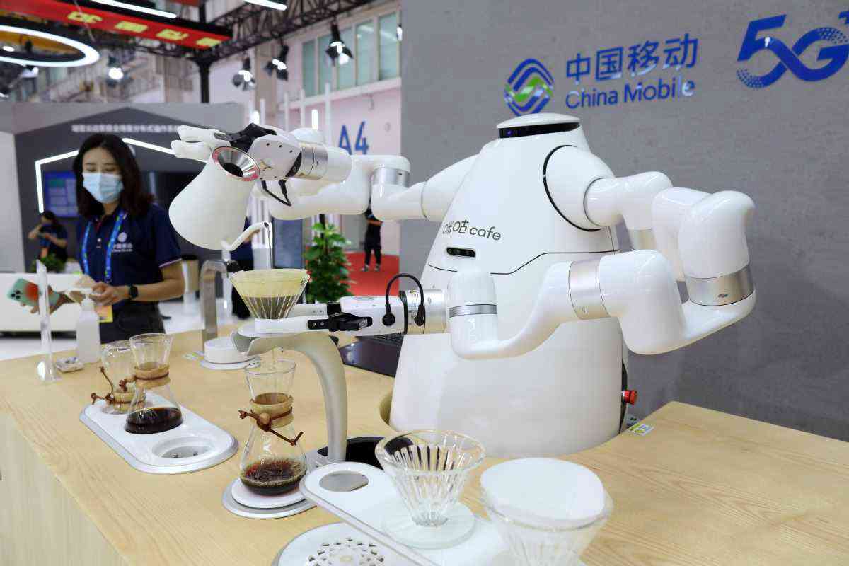 8月31日,拍攝大會展覽上5G智能機器人演示泡咖啡。中國日報記者 朱興鑫 攝