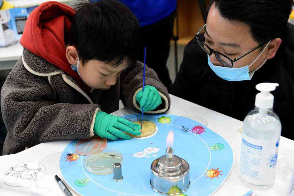 12月11日,在安徽省科技館,小朋友在家長的陪同下制作微生物藝術畫。(新華社記者 黃博涵 攝)