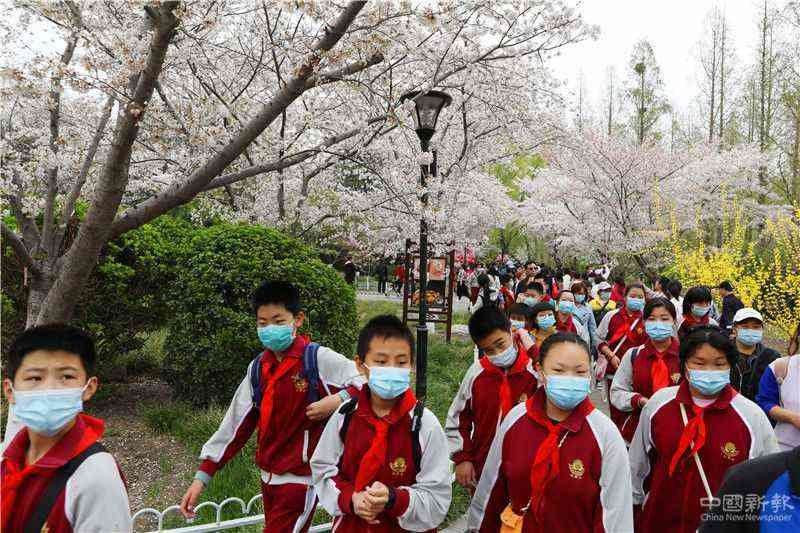 2021年4月1日,小學(xué)生在北京玉淵潭公園賞櫻。(中國日?qǐng)?bào)記者 朱興鑫 攝)