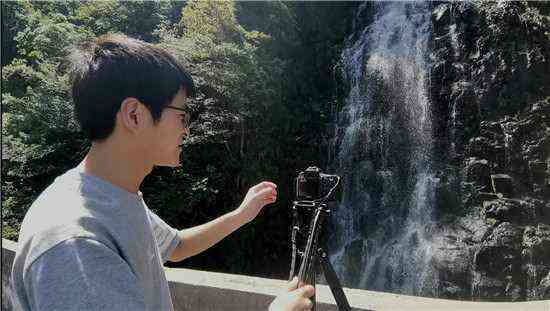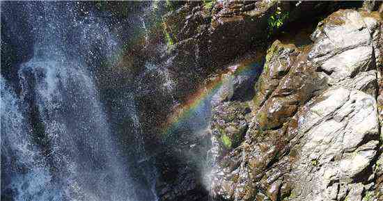 只見(jiàn)陽(yáng)光穿過(guò)瀑布,在無(wú)數(shù)細(xì)小的水滴間產(chǎn)生折射,水花簇?fù)碓陉?yáng)光下,形成了兩條彩虹,一條鮮艷奪目,赫然立在眼前;一條朦朧起霓,浮現(xiàn)在瀑布中間。