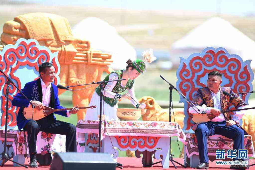 6月3日,在新疆阿勒泰地區(qū)福海縣沙爾布拉克轉(zhuǎn)場文化旅游小鎮(zhèn),人們參加阿肯阿依特斯表演。