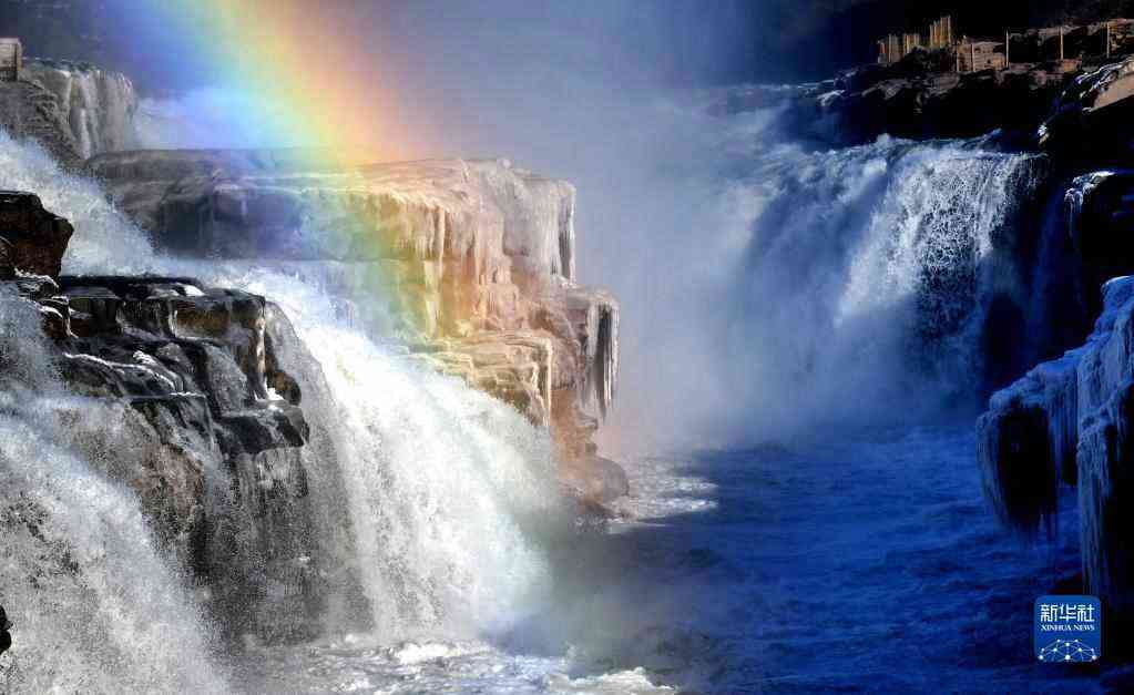 近日,隨著氣溫驟降,黃河壺口瀑布呈現(xiàn)出別樣奇觀:飛濺的浪花,在兩岸崖壁之上凝固成巨大冰瀑,點(diǎn)綴著一條條銀裝素裹的冰柱,玲瓏剔透,錯(cuò)落有致;激起的水霧,在陽光的映射下,彩虹橫亙其間,宛如一幅幅畫卷。