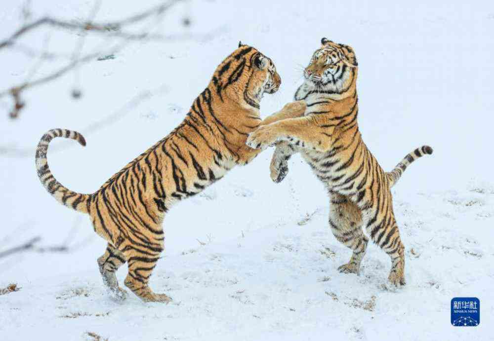 12月26日,在山東省榮成市西霞口神雕山野生動物世界獅虎園內(nèi),兩只東北虎在雪中嬉戲打鬧。