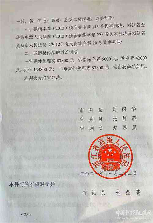 此后,蓮花公司向中央紀(jì)委、中央政法委、最高人民法院等部門反映,向浙江高院申訴,引起了浙江高院的高度重視。浙江高院在江西法院對(duì)楊興元涉嫌詐騙案查明的事實(shí)基礎(chǔ)上,再經(jīng)過深入細(xì)致的調(diào)查,依法對(duì)案件進(jìn)行了再審,撤銷了原義烏法院、金華中院、浙江高院作出的判決,駁回了楊尚琴的訴請(qǐng),糾正了三級(jí)法院的錯(cuò)判,維護(hù)了蓮花公司的合法權(quán)益,捍衛(wèi)了法律的公正與尊嚴(yán)!(記者 熊慧平)