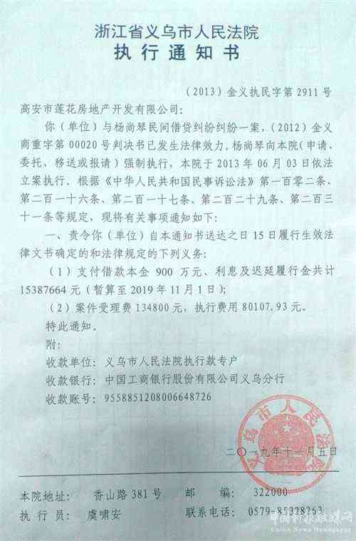 此后,義烏法院凍結(jié)了蓮花公司銀行賬戶、查封了蓮花公司6000多萬的資產(chǎn),并追究法定代表人拒執(zhí)責(zé)任,劃走蓮花公司現(xiàn)金350余萬元,200多萬元轉(zhuǎn)給了楊興元。后又多次強(qiáng)制執(zhí)行。迫于無奈,蓮花公司遂按義烏法院強(qiáng)制執(zhí)行的要求,將執(zhí)行款項(xiàng)匯給了義烏市法院指定賬戶,共計(jì)1970余萬元。