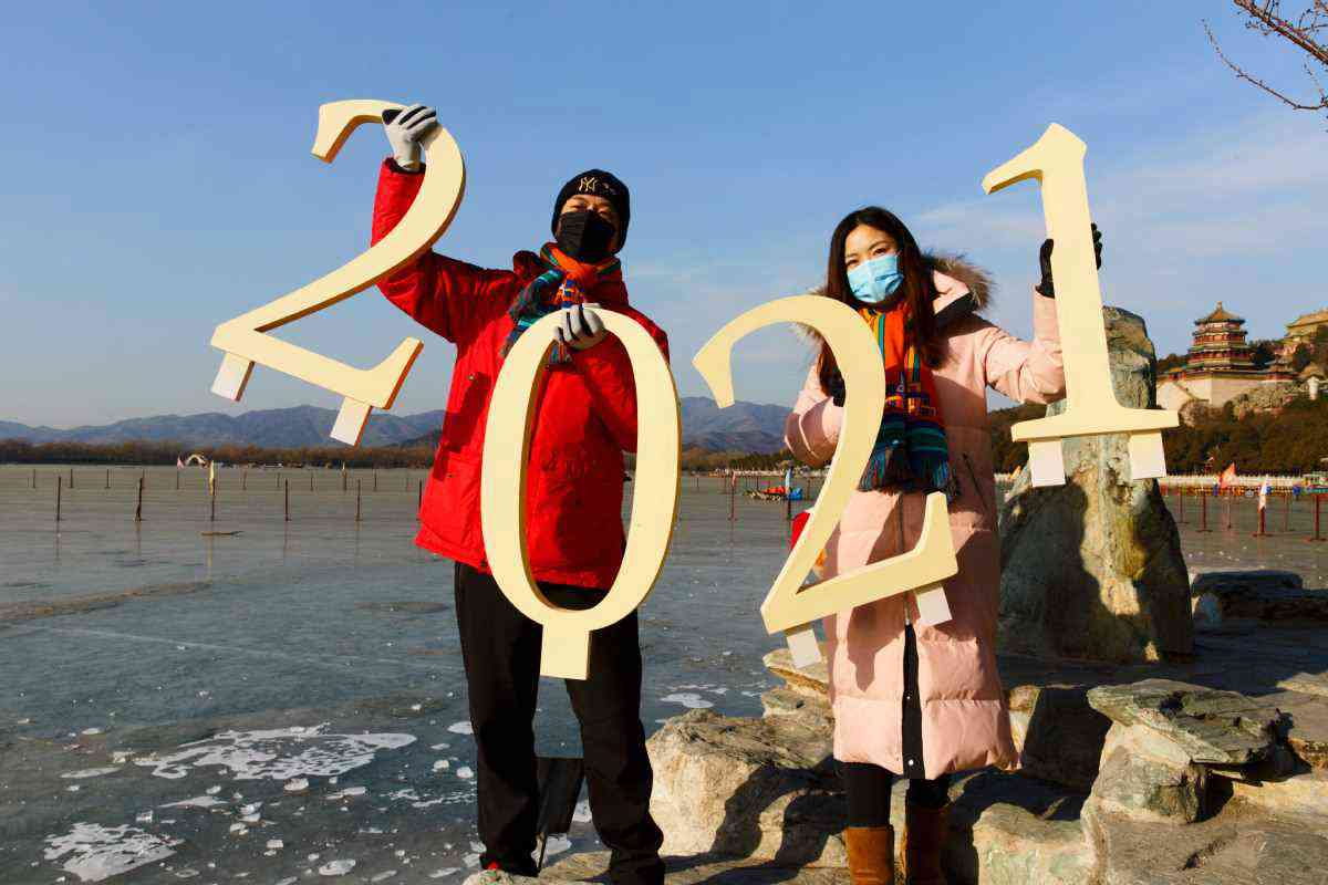 1月1日,北京頤和園公園,一對情侶手持“2021”符號迎接新年第一天。 中國日報(bào)記者 姜東 攝