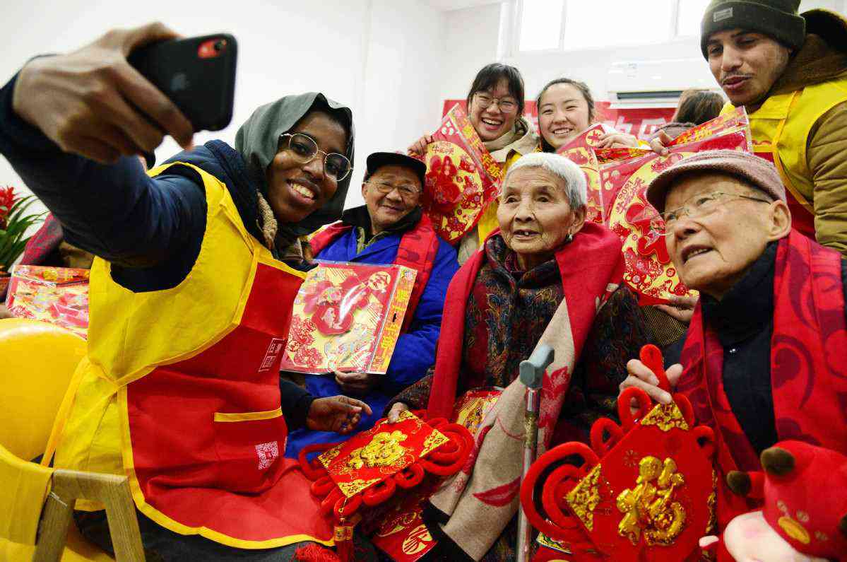 1月1日,在江蘇省鎮(zhèn)江市新城社區(qū)居家養(yǎng)老服務(wù)中心,外國留學(xué)生與老人們一起歡慶新年的到來。石玉成 攝