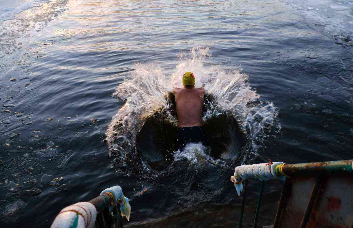 1月1日,在遼寧省沈陽北陵公園,冬泳愛好者在寒冷的湖水里游泳。 黃金崑 攝