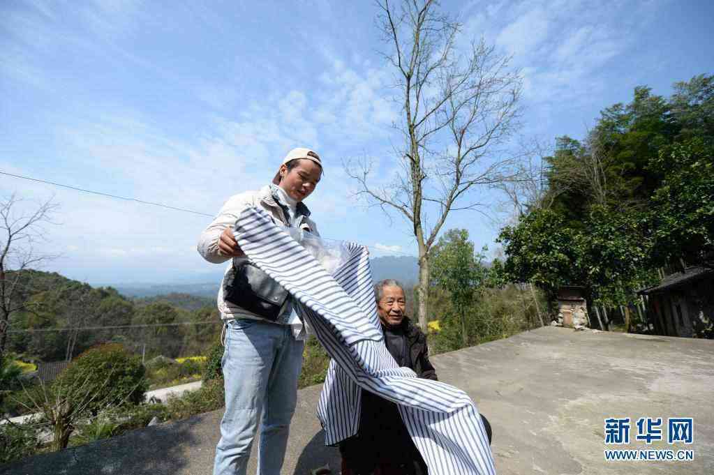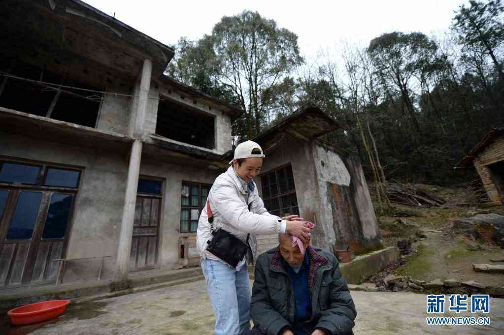 在慈利縣南山坪鄉(xiāng)梁山村,卓一航理發(fā)前為老人擦臉(3月3日攝)。新華社記者 陳振海 攝