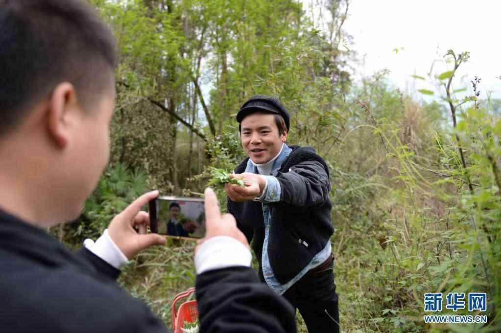 卓一航在慈利縣老家采摘蒿葉,拍攝短視頻(3月20日攝)。新華社記者 陳振海 攝