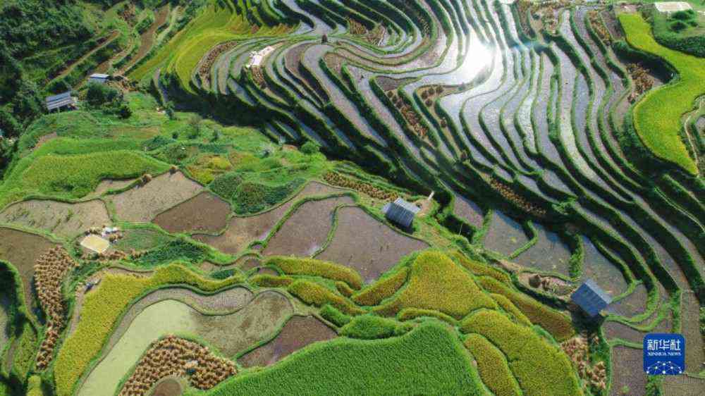 時下,在貴州省黔東南苗族侗族自治州從江縣加榜鄉(xiāng),梯田里種植的稻谷喜獲豐收,當(dāng)?shù)卮迕衩χ崭?、晾曬,鄉(xiāng)間梯田一派豐收景象。