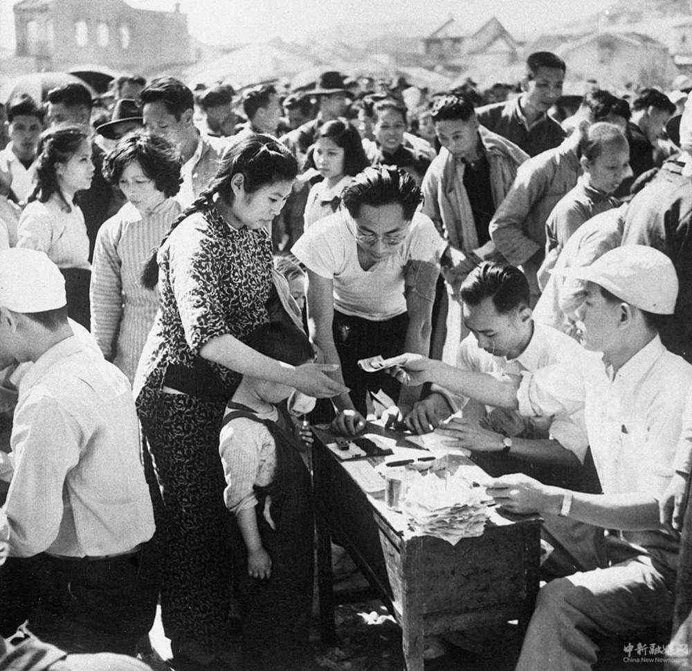 圖為香港九龍城東頭村受災(zāi)同胞領(lǐng)取救濟金。新華社稿