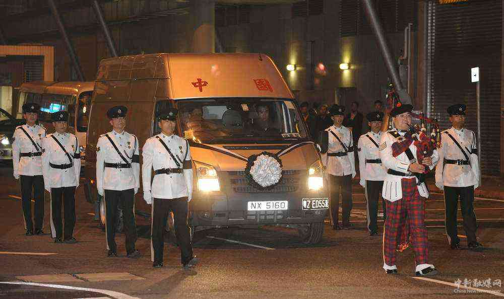 2010年4月18日晚,香港警員儀仗隊在深圳灣口岸舉行在青海玉樹地震中為救人捐軀的香港義工黃福榮靈柩交接儀式。新華社記者 呂小煒 攝