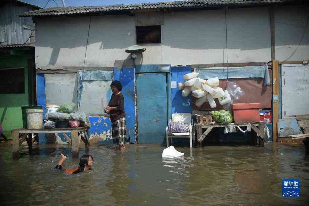 11月9日,印度尼西亞雅加達(dá)海邊的居民區(qū)被積水淹沒(méi)。新華社發(fā)(祖卡南攝)