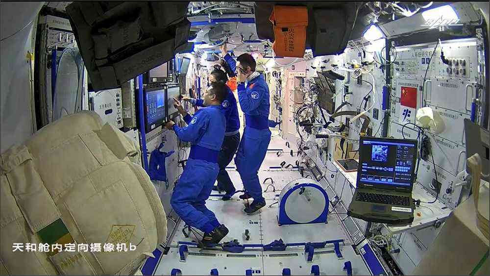 資料圖:神舟十三號航天員空間站工作照(天和艙內(nèi)定向攝像機(jī)b攝)