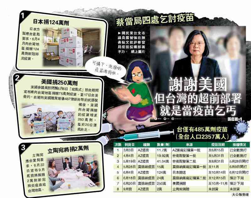 臺當局防疫不力,遲遲無法買到足夠的新冠肺炎疫苗,但又大搞“政治防疫”,拒絕大陸疫苗進口,于是四處乞討疫苗。最近日本、美國合共向臺灣地區(qū)捐贈了374萬劑疫苗,立陶宛則宣布在9月之前捐贈2萬劑疫苗。此外,近50名民眾22日提告臺灣地區(qū)領導人蔡英文等人延宕民間引入國際疫苗、護航臺產(chǎn)疫苗的行為涉嫌瀆職、圖利罪。在北京,中國外交部發(fā)言人趙立堅批評臺當局在抗疫合作上大搞政治操弄,有違基本的人道主義精神。