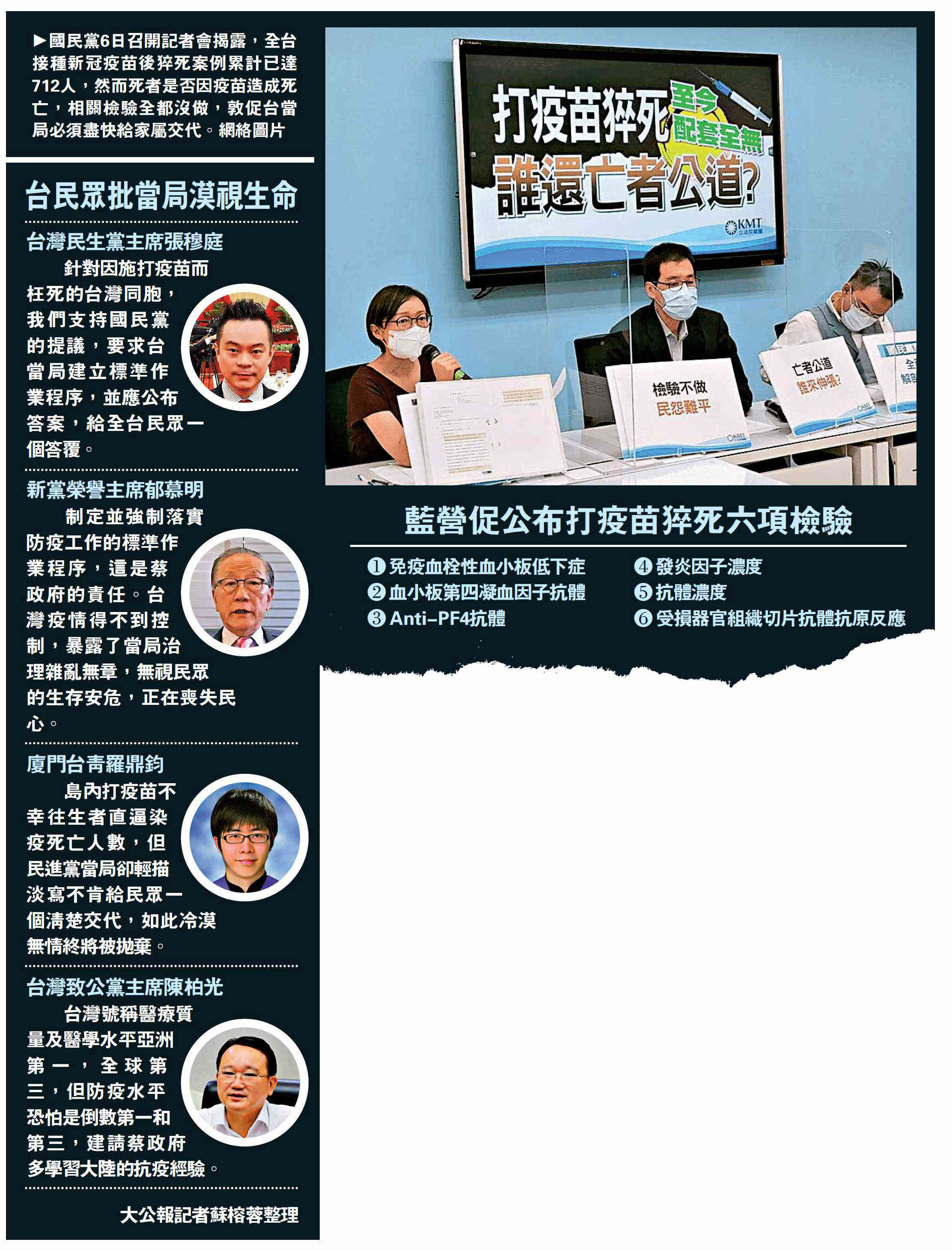臺灣地區(qū)接種新冠疫苗后猝死的案例累計達(dá)712人,中國國民黨“立院”黨團6日召開記者會揭露,目前上述死者是否因疫苗造成死亡,相關(guān)檢驗全都沒做,臺衛(wèi)福部門和法務(wù)部門則互踢皮球,民進黨當(dāng)局必須盡快訂立SOP(標(biāo)準(zhǔn)作業(yè)程序),給家屬交代。兩岸專家向大公報表示,臺灣現(xiàn)在疫情惡化,疫苗施打又亂象頻出,完全是當(dāng)局瘋狂催谷臺灣自產(chǎn)疫苗所致,為了其政治利益而不惜草菅人命。
