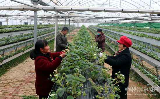 2022年1月6日,安徽省合肥市廬江縣泥河鎮(zhèn)沙溪村連體鋼構(gòu)保溫大棚里,村民正在為今年種植的立體無土栽培草莓進(jìn)行疏果,這一茬草莓可望在春節(jié)前上市。