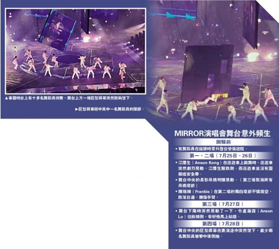 接連發(fā)生意外的男團(tuán)MIRROR紅館演唱會(huì),昨再發(fā)生恐怖意外。昨晚約十時(shí)半,MIRROR第四晚演唱會(huì)開騷期間,臺(tái)中央一塊懸于半空的巨型電視屏幕突然墜下,至少兩名舞蹈員被擊中,當(dāng)場倒地受傷。演唱會(huì)需即時(shí)腰斬,觀眾即時(shí)疏散離場。
