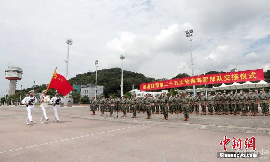 8月29日,根據(jù)《中華人民共和國香港特別行政區(qū)駐軍法》規(guī)定和中央軍委命令,中國人民解放軍駐香港部隊陸??杖姴糠纸ㄖ茊挝弧⒀b備進行第25次輪換。圖為海軍部隊交接儀式。 中新社發(fā) 易定 攝