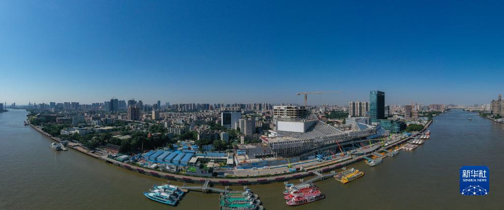 廣東美術(shù)館、廣東非物質(zhì)文化遺產(chǎn)展示中心、廣東文學(xué)館“三館合一”建筑長350米,高近80米,宛如一艘“文化巨輪”揚帆珠江(10月12日攝,無人機全景照片)。