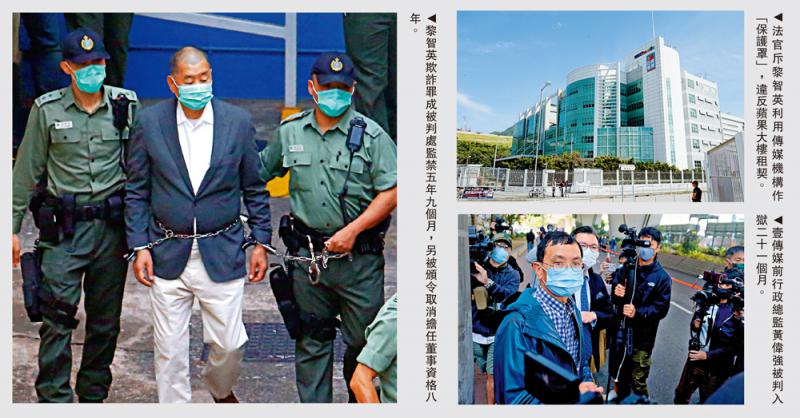 左圖:黎智英欺詐罪成被判處監(jiān)禁五年九個月,另被頒令取消擔任董事資格八年。右上圖:法官斥黎智英利用傳媒機構作“保護罩”,違反蘋果大樓租契。右下圖:壹傳媒前行政總監(jiān)黃偉強被判入獄二十一個月。