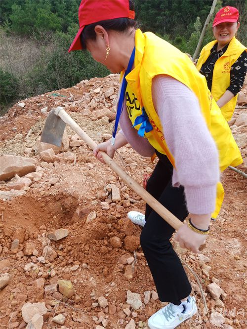 上午十點,植樹活動正式開始,大家三人一組、兩人一隊,按照“三埋兩踩一提苗”的樹木栽植要點,有的揮鋤挖洞、有的扶苗栽樹、有的鏟土填土、有的澆水灌溉,所有人默契分工合作、干活的勁頭十足。此次植樹節(jié)活動按照“生態(tài)造林、適地適樹”的原則,結合生態(tài)環(huán)保建設和助力鄉(xiāng)村振興需要,栽植的都是適合當?shù)貧夂蚺c環(huán)境的樹種。經(jīng)過大家兩個多小時的齊心協(xié)力,一棵棵種植好的樹苗錯落有致、迎風挺立,讓荒蕪的山坡立馬煥然一新,增添了綠意。