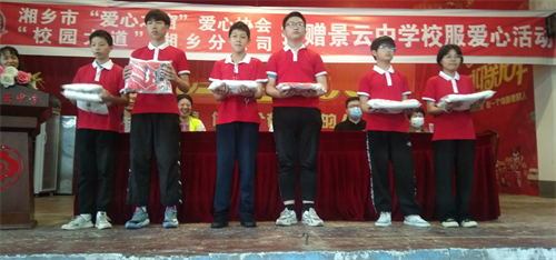 在捐贈儀式上,作為主辦方的福建“校園大道”湘鄉(xiāng)分公司負(fù)責(zé)人周青芳女士向景云中學(xué)的300名孩子每人捐贈一件紅色的短袖校服和50件籃球服。湘鄉(xiāng)市委宣傳部副部長賀文春作了熱情洋溢的講話,他以“強(qiáng)國有我”和“志愿服務(wù)有我”為主題,借用周青芳女士創(chuàng)業(yè)和湘鄉(xiāng)市“愛心之窗”愛心協(xié)會18年發(fā)展歷程的故事,勉勵(lì)獲得資助的學(xué)生能夠胸懷大志,努力學(xué)習(xí);在將來的生活和工作中能夠懷感恩之心,為建設(shè)社會主義現(xiàn)代化強(qiáng)國貢獻(xiàn)自己的一份力量,同時(shí)也能夠在以后的工作中多從事愛心志愿活動,把志愿精神傳遞下去。