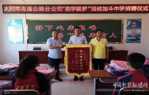 慰問老兵和困難群眾后,大家隨即來到廣靈縣加斗中學(xué) 開展“助學(xué)圓夢”活動(dòng)加斗中學(xué)捐贈(zèng)儀式。向貧困生捐贈(zèng)書包 等學(xué)習(xí)用品,并鼓勵(lì)孩子們要發(fā)奮讀書,積極進(jìn)取,將來用所學(xué)知識(shí)回報(bào)社會(huì),為祖國和家鄉(xiāng)做貢獻(xiàn)。儀式結(jié)束之余, 還向?qū)W生們宣講了交通安全知識(shí),使廣大同學(xué)能夠增強(qiáng)交通 安全意識(shí),為共建平安和諧校園做出貢獻(xiàn)。最后,校方帶領(lǐng)大家參觀教學(xué)樓內(nèi)的國防教育主題長廊,從學(xué)生階段培養(yǎng)國 防觀念對國防教育起到重要作用,依托國防教育建設(shè),助力鄉(xiāng)村發(fā)展提質(zhì)。為感謝大同南高速公路分公司和各收費(fèi)站、 維護(hù)站黨支部等愛心單位對加斗中學(xué)的關(guān)心和幫助,加斗中學(xué)向愛心單位敬贈(zèng)錦旗。