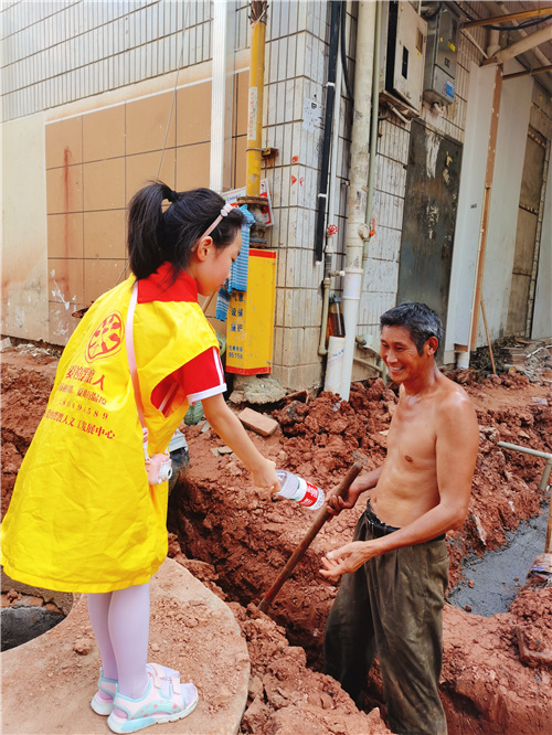 啟動(dòng)儀式剛一結(jié)束,同學(xué)們就把自己帶來(lái)的礦泉水依次放進(jìn)冰柜。隨后,大家紛紛走到戶(hù)外給高溫下辛勞付出的快遞小哥、外賣(mài)騎手、交通警察、環(huán)衛(wèi)工人、物業(yè)管理人員、建筑工人、電力工人等戶(hù)外工作者送上了冰涼的愛(ài)心礦泉水。
