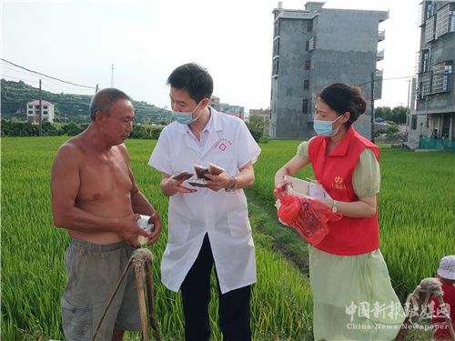 7月17日,新寧縣大邵公益黨支部聯(lián)合金石鎮(zhèn)春風社區(qū)陳建軍衛(wèi)生室走進田間地頭給村民送醫(yī)送藥。受到當?shù)厝罕姾迷u。