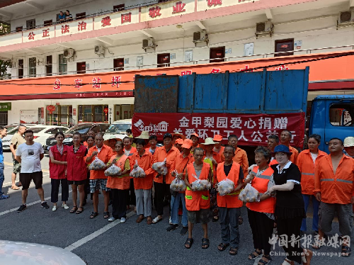 據(jù)悉,每年金甲梨園在梨子采摘后,都會開展以“夏天送清涼”關(guān)愛城市守護(hù)者行動為主題的公益行動,為環(huán)衛(wèi)工人送去高溫下的一抹清涼。