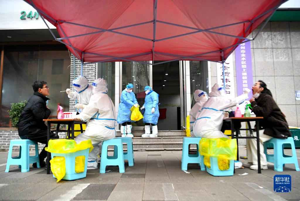 1月10日,人們在鄭州市緯一路一核酸檢測點接受核酸檢測取樣。