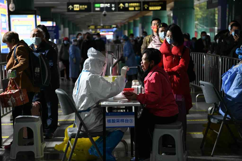 1月10日,在深圳火車站,抵深旅客進行核酸檢測。(新華社記者梁旭 攝)