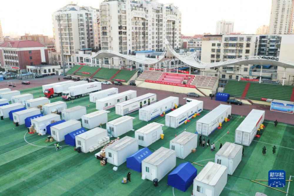 這是1月12日拍攝的位于天津市濱海新區(qū)塘沽體育場(chǎng)內(nèi)的方艙實(shí)驗(yàn)室(無(wú)人機(jī)照片)。