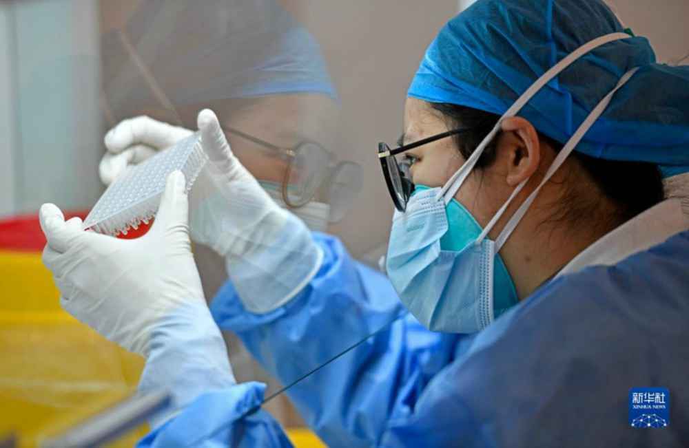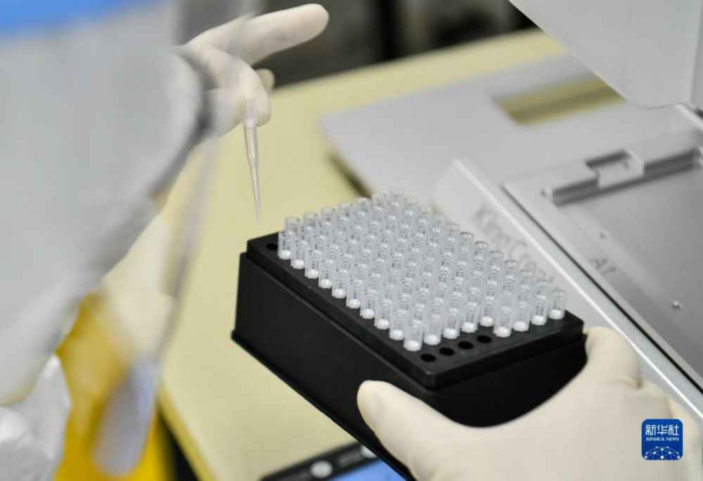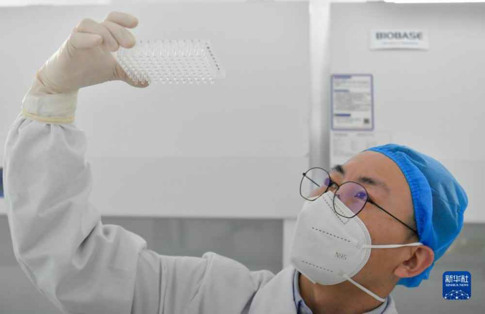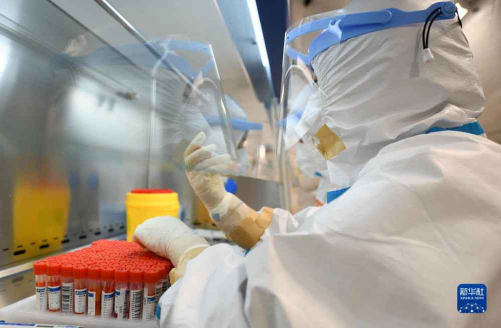 1月13日,在天津市北辰區(qū)某高校,氣膜實(shí)驗(yàn)室工作人員在樣本處理區(qū)作業(yè)。