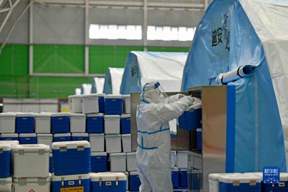 1月13日,工作人員向?yàn)I海新區(qū)漢沽網(wǎng)球館內(nèi)的氣膜實(shí)驗(yàn)室運(yùn)送新冠病毒核酸檢測(cè)樣本。