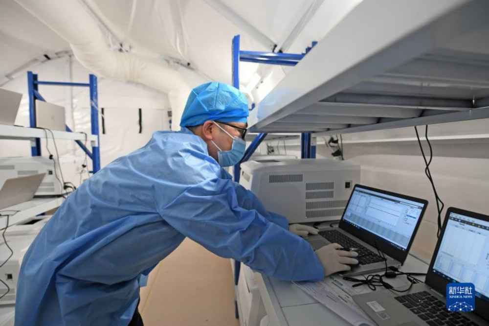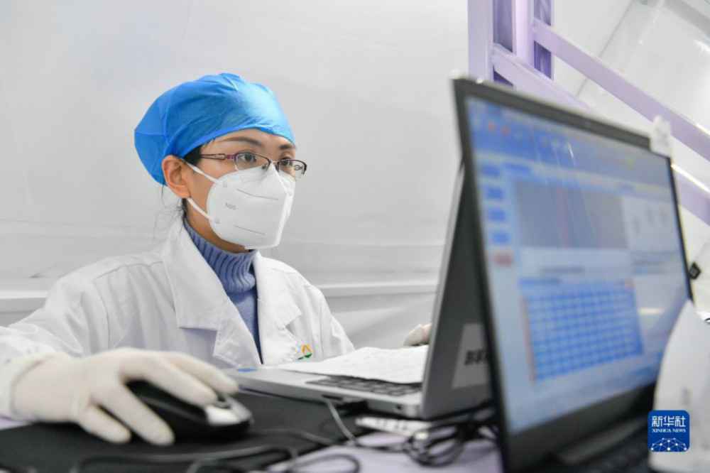 1月13日,在天津市北辰區(qū)某高校,氣膜實(shí)驗(yàn)室工作人員在擴(kuò)增分析區(qū)分析核酸樣本數(shù)據(jù)。