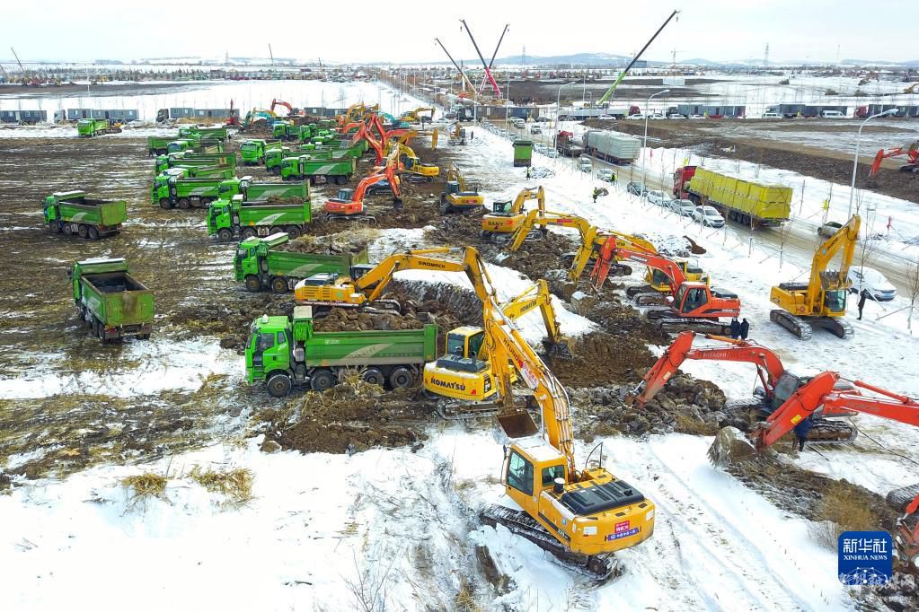 工程機械在吉林市高新南區(qū)隔離方艙現(xiàn)場施工(3月13日攝,無人機照片)。新華社記者 張楠 攝