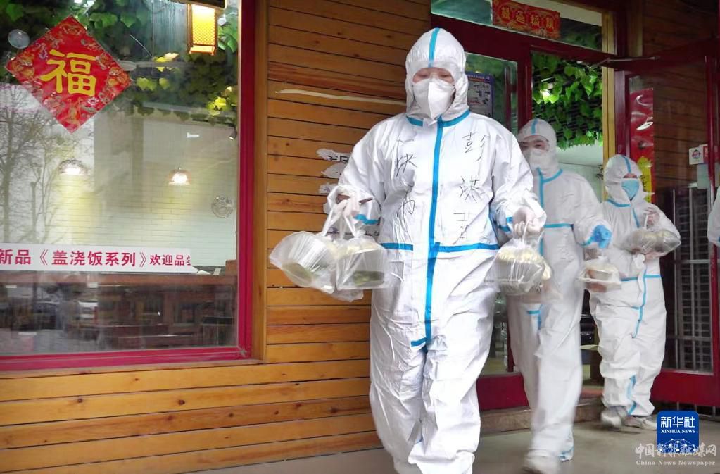 3月12日,山東青島萊西市“一塊幫”青年志愿者為一線抗疫人員取餐配送(視頻截圖)。新華社發(fā)