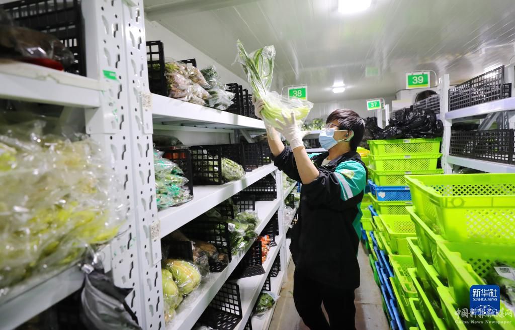 3月15日深夜,在位于上海閔行區(qū)老滬閔路的一家網(wǎng)絡購物平臺倉配站點,工作人員在冷藏庫內(nèi)將新到貨的蔬菜分類擺放到貨架上。新華社記者 方喆 攝