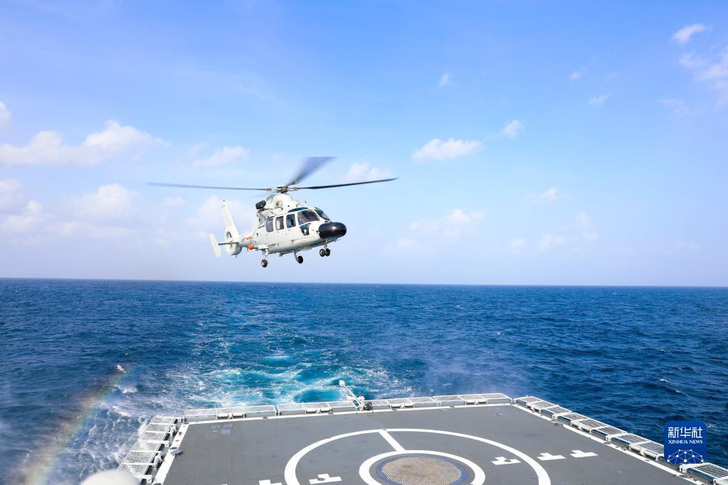 中國海軍第40批護(hù)航編隊(duì)呼和浩特艦組織艦載直升機(jī)起降訓(xùn)練(2月9日攝)。