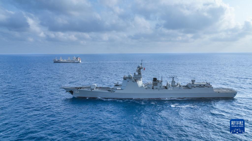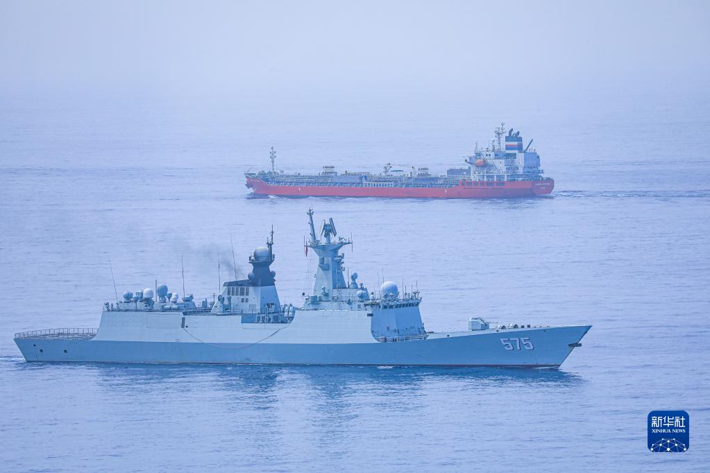 中國海軍第40批護(hù)航編隊(duì)呼和浩特艦(下)為“海洋之星”輪護(hù)航(4月9日攝)。